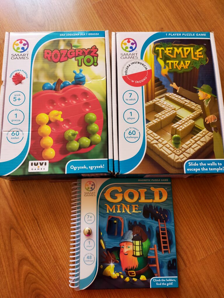 - Gry z serii „Smart games” – rozwijają u dzieci przede wszystkim umiejętność myślenia logicznego, przestrzennego, kształtują umiejętność pracy indywidualnej oraz wspierają rozwój koncentracji uwagi, poczucia sprawstwa. Dostępne różne poziomy trudności.